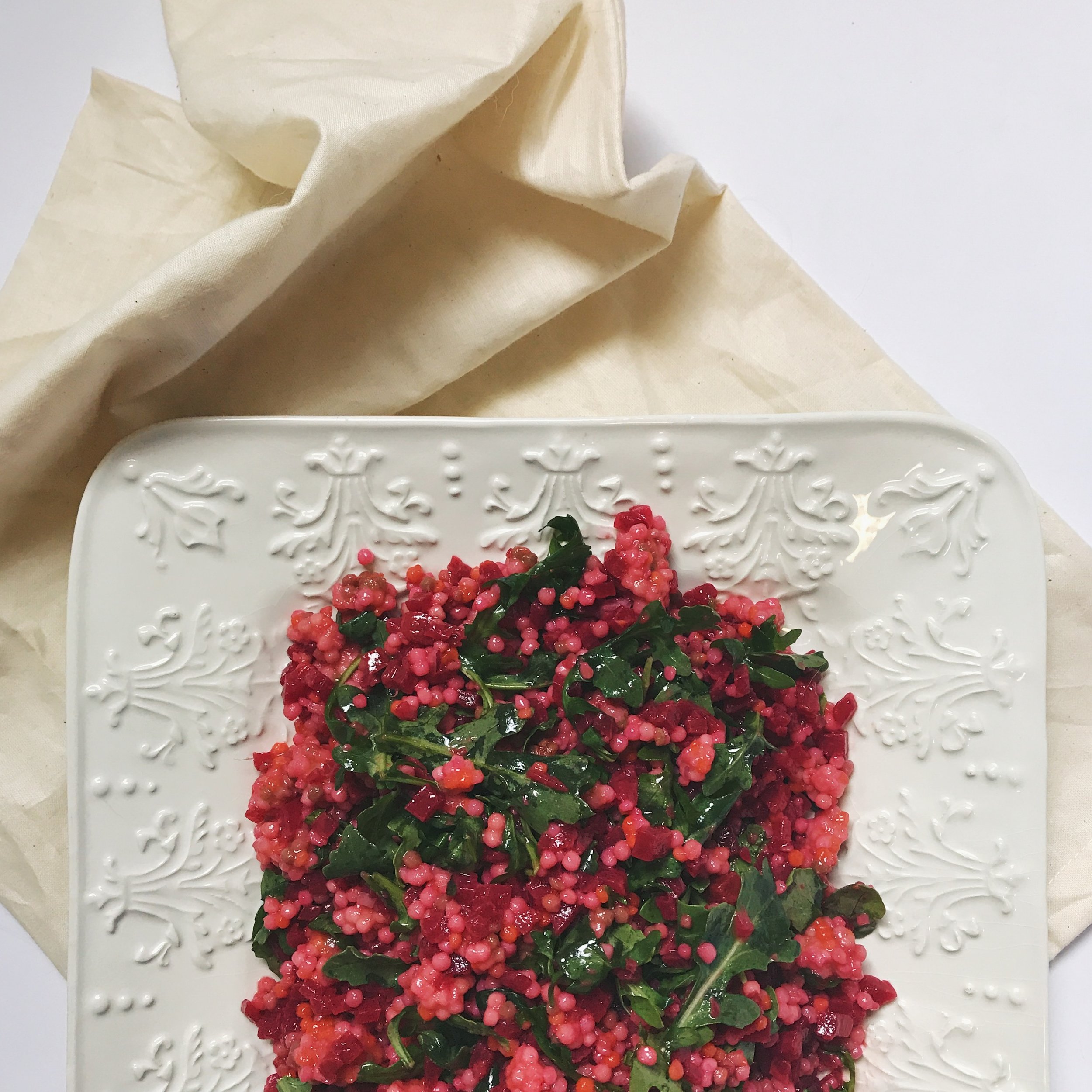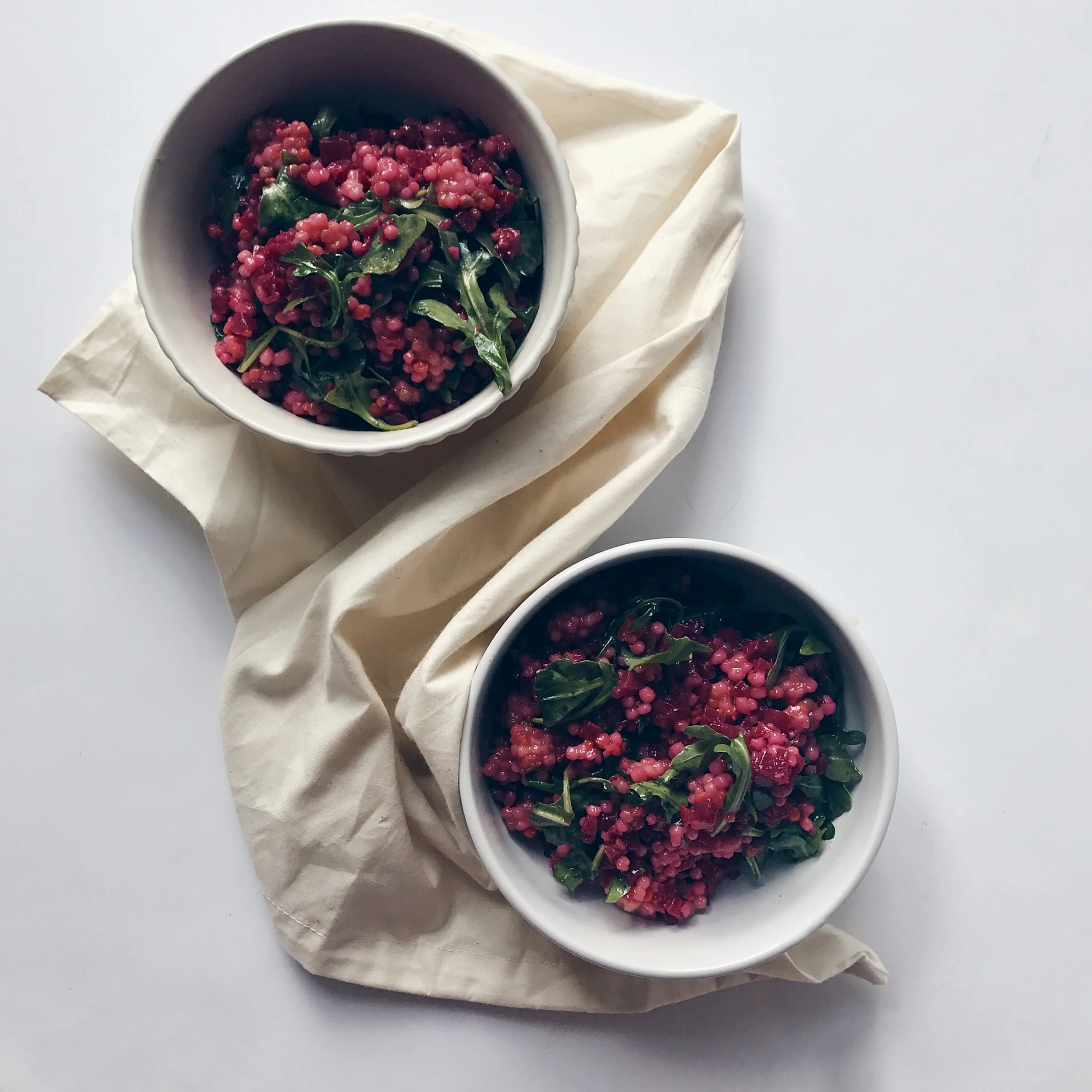 - Once couscous is cool, in a large mixing bowl, add couscous, arugula, beet, and salt. Add vinaigrette and toss to mix to fully combine.