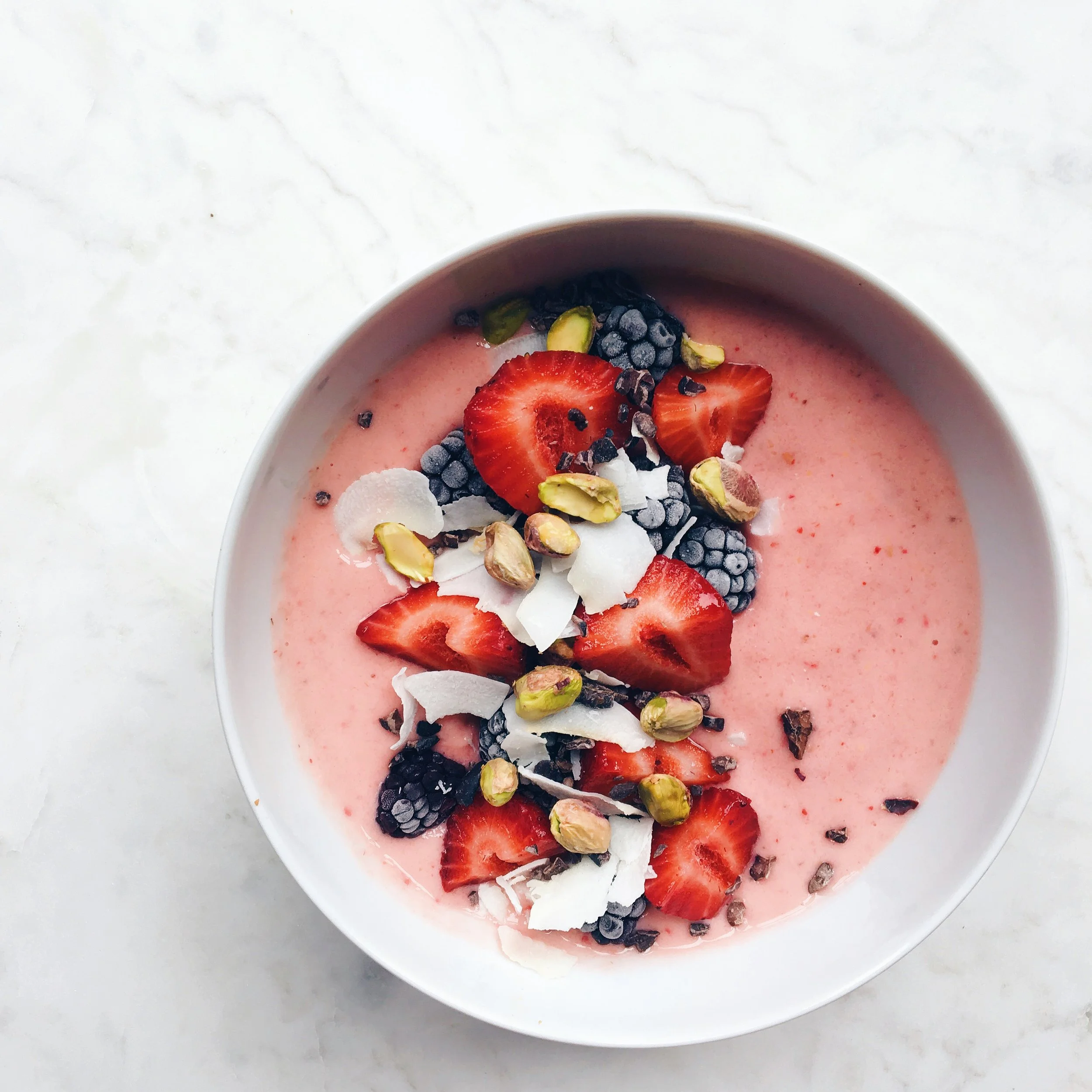 toppings: fresh organic strawberries, frozen organic blackberries, organic coconut flakes, and raw pistachios!